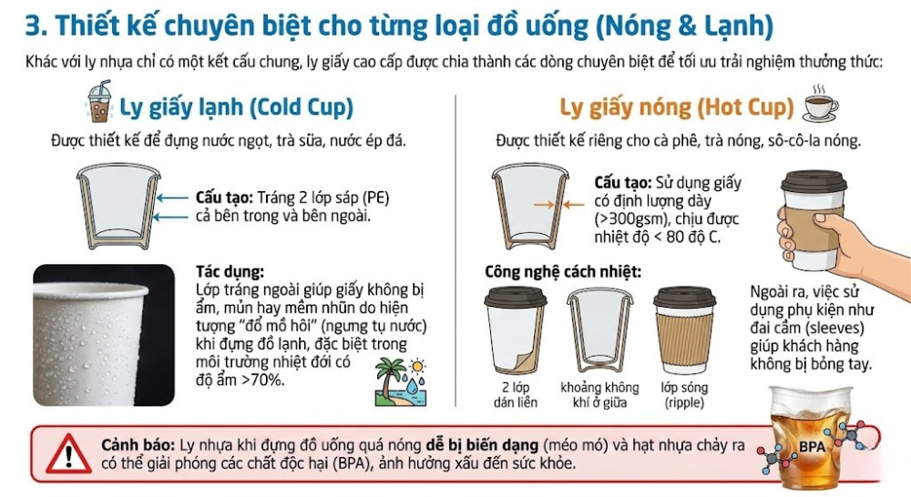Khác với ly nhựa chỉ có một kết cấu chung, ly giấy cao cấp được chia thành các dòng chuyên biệt để tối ưu trải nghiệm thưởng thức: